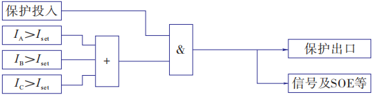 短路保護主要針對電動機電纜或繞組出現(xiàn)的短路故障,短路保護動作邏輯見圖1。任意一相電流超過設定值就應立即保護動作,所以電流定值一般為額定電流的5~7倍,動作延時0s。提升機在運行時幾乎不可能達到相應整定電流,因此該保護僅對電動機具有保護作用,對提升機其他部件沒有保護作用。